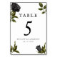 Gothic and elegant wedding table number featuring illustration of black roses on a white background. Perfect for a halloween wedding.