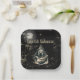 Gothic Haunted House Witch Halloween Costume Party Paper Plates. These party plates features a dark, Gothic design with a misty black background. Ornate rustic golden accents frame the card, while the event title, "Haunted Halloween" is displayed in a eerie gold Gothic script. Subtle image of a spooky witch mixing her magical potion and a full moon enhance the eerie atmosphere.