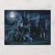 Gothic Mansion Under Full Moon with Bats in a Spooky Night Scene Post Card. Embrace the eerie elegance of Halloween with this stunning postcard design featuring a hauntingly beautiful Gothic mansion. A glowing full moon illuminates the dark, ivy-covered structure, while bats soar through the night sky, adding a chilling touch. The atmospheric lighting and intricate details make this design perfect for those who appreciate the mysterious allure of October nights. Ideal for sending spooky greetings that will leave an unforgettable impression.