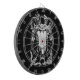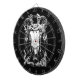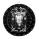 An old world mythical creature adorned with bells, tassels and many other things. He has horns and fangs and is framed with gothic trim. Done in black and white. An interesting and unique image.