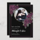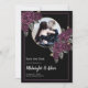 Darkly beautiful save the date card with gold circle and dark purplish roses on a black background with matching border. Script typography for the names. Personalize with your own photo and wedding date and place.