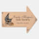 A hand-drawn Halloween Baby Shower directional sign from our "A Baby is Brewing" baby shower collection, illustrated in black ink. Features illustrations of an vintage baby carriage, black crow, pumpkins and spiderwebs on an elegant orange background. This sign is printed on both sides and can be used for pointing RIGHT or LEFT.