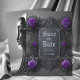 Announce your wedding plans in style with this gothic themed save the date flat card featuring purple roses on a fancy gray frame and your names, wedding date and photo on the back to personalize. Designed by Susan Coffey. Images generated with AI.