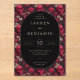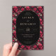 This wedding invitation features a striking gothic yet romantic design, blending Victorian elegance with a macabre twist. The central oval frame is surrounded by a repeating pattern of red roses and white skulls on a dark backdrop, creating an intriguing contrast between beauty and morbidity. Classic serif fonts are used for the customizable text, ensuring clarity against the busy background while maintaining an elegant and mysterious tone. Perfect for couples seeking a unique and edgy aesthetic, this invitation sets the stage for a memorable celebration.