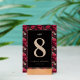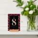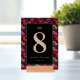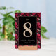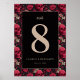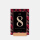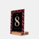 This wedding table card features a striking black background adorned with an intricate border of red roses and skulls, creating a gothic yet romantic theme. The central beige number "8" is elegantly framed by delicate script and clean sans-serif typography, offering a sophisticated touch. The design blends mystery and celebration, making it perfect for adding a unique flair to your wedding decor. Its bold color palette and illustrative style ensure it stands out as both a functional and artistic piece.