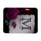 A personalized monogram flex magnet with a gothic look. An old graying parchment paper with hints of purple-red around the edges. A magenta rose in full bloom, a rosebud, a candle, and silver locket on a dark burgundy background creates a beautiful, dark and mysterious gothic design. Personalize with your monogram letter and name.