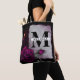 Tote bag with a gothic look. An old graying parchment paper with hints of purple-red around the edges. A magenta rose in full bloom, a rosebud, a candle, and silver locket on a dark burgundy background creates a beautiful, dark and mysterious gothic design. Personalized with a name and monogram initial.