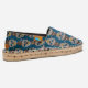 This awesome pair of espadrilles features a creepy gray skull with glowing blue eyes and rotting yellow teeth. On top of the skull is a brown rat with pink ears, tail, paws and nose and blue eyes, The rat has an arched back ready to leap out at you. A great design for rat lovers and for Halloween.