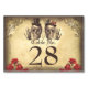Fun and creative wedding table number cards with skull couple wearing red and black hats