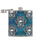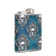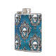 A skull image is framed with an ornate gothic style design and placed in a pattern that covers the surface of this unique flask. The pattern is placed on a gradient royal blue background.