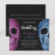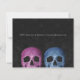 Gothic skull head vintage pink, blue, black Halloween wedding budget flat card invitation. Fun, spooky Hallowedding. Till Death Do Us Part script on texture print. Image copyright Marg Seregelyi Photography.