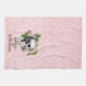 This towel features a vintage drawing of a skull with pink roses on a pink damask background. The words "Happy Halloween" is written in a spooky font.