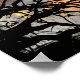 An ornate gothic frame with elegant scrollwork and tree-branch silhouettes surrounds a picturesque scene of a garden solarium in autumn hues, which sits next to a pond reflecting the rosy sunset and a flock of dark birds.