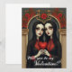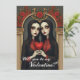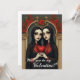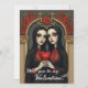 Dark romantic illustration of gothic twin women holding a red heart, framed by ornate golden details and roses. A moody Valentine design blending vintage elegance, symmetry, and mysterious charm—perfect for lovers of gothic romance.