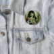 The dead zombie girl on this scary Halloween button has some lovely green skin, open bloody wounds and all-white eyeballs. She's dressed as a gypsy in shabby, stained clothes and looks very romantic and dramatic as she wanders through the foggy forest. Clutched poetically in her hands are an axe and a knife. She looks sort of like the modern Mona Lisa of zombies, with a little smile on her green lips. This is a nice spooky button for Halloween or all year for the zombie fan.