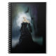 White haired woman in black gothic corseted victorian dress. Ravens, mist and forest all around.