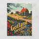 A captivating vintage portrayal of Gotland, Sweden's largest island in the Baltic Sea, known for its medieval architecture, scenic landscapes, and cultural heritage. The design features Gotland's iconic medieval city walls, picturesque countryside with windmills and farms, and the serene coastline dotted with historic fishing villages. Rendered in a nostalgic style, the artwork evokes the island's tranquil charm and historical richness, inviting viewers to explore its unique blend of natural beauty and cultural treasures.