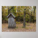 A wooden outhouse at Pioneer Village at Harry S Truman Dam Visitor Center in Warsaw, Missouri, United States. Before bathrooms were built in houses, they used outhouses.