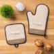 Gourmet Catering Oven Mitt & Pot Holder Set has a typography and neutral colors that are all in harmony, perfect for a catering business promotional kitchen stuff.