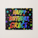 This fun, exciting, birthday-themed jigsaw puzzle design has the message "HAPPY BIRTHDAY, GRACE" with the characters having a colorful rainbow spectrum inspired gradient pattern, in addition to a vibrant stars background pattern. An exciting puzzle like this might be used to send birthday wishes to somebody named Grace. [~Z0000468]