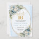 Celebrate a milestone moment with this elegant Sweet Sixteen invitation, featuring a refined watercolor design of dusty blue florals blended with soft white flowers and fresh eucalyptus greenery. Framed by a shimmering gold glitter border and paired with graceful script lettering, this invitation sets a sophisticated tone for a truly unforgettable Sweet Sixteen, Sweet 16th, or 16th birthday celebration.