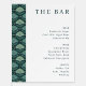 This elegant wedding menu design features a sophisticated and modern aesthetic with a focus on clean typography and an intricate, leafy pattern border. The color palette combines rich greens and whites, creating a fresh and inviting atmosphere perfect for a refined celebration. Ideal for couples looking to add a touch of understated elegance to their special day, this design exudes a sense of timeless charm and grace. Its customizable text area allows for personalization while maintaining its polished look, making it suitable for various wedding themes and settings.