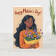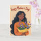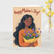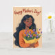 This design shows a graceful woman with long, flowing dark hair resting around her shoulders, her eyes closed and her smile soft as if she’s savoring a kind moment from someone close ❤️. Her warm skin tone is shaded with a rosy blush and fuchsia lips, and a small white stud earring catches the light near her ear. She wears an orange long-sleeved top that echoes the cozy mood of the scene and draws attention to her relaxed posture. In her hands, she holds a full bouquet wrapped in a golden-yellow paper cone, hugged close like a quiet thank-you. The flowers mix deep purple tulips, orange daisy-like blooms with dark centers, tiny yellow blossoms, and slender green leaves, creating the sense of a thoughtful gift chosen with care 🌼. Across the top, the words “Happy Mother’s Day!” sit centered in flowing reddish-brown lettering against a soft peach background. Her fingernails are painted a light blue, visible where her fingers curl gently around the bouquet wrap.