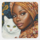 A captivating portrait of a young African woman in a vibrant patterned headwrap, gently holding a white cat, set against a lush botanical background.