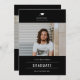 Graduation Cap accent, photo graduation announcement and invitation in classic black color with white typography. Template lines for graduate's name, class of year and school. Back of card features 1 additional photo space with text lines for your open house/graduation party details.