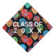 This graduation cap topper features a festive design of patterned balloons in shades of red, blue, purple and gold with the words "Class of 20XX" to personalize. Designed by world renowned artist ©Tim Coffey.