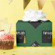 Creative graduation gift wrap and grad party decor featuring black and gold graduation cap on green background. To personalize edit text to add his or her name and the class year.