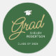 Round graduation sticker in green and gold perfect for sealing invitations or announcements. The design features the word "grad" in modern, elegant gold handwriting script against a dark green background.