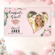 This elegant blush pink floral graduation banner features a heart shape photo template, a "Congrats, Grad!" saying, and a graduate's cap illustration. Personalize with the graduate's name, upload a custom photo via template, and type a year before ordering.