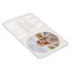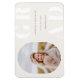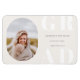 Rounded photo frame, senior class graduation announcement magnet. Soft ivory beige background, white bold type "GRAD" and coordinating gray text template lines for graduate's name, class of year and school.
