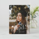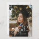 Stylish and modern graduation announcement card to send out to family and friends. Overlay typography text in a swirly font that says Grad. You can add a second picture on the back and the message is editable.