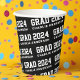 Graduation paper cups featuring the text "GRAD" and your year in a college sports font with the graduate name below. White text on black or custom color background.