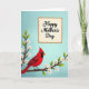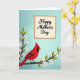 The front design shows a bright red bird with a tall crest and a dark face mask resting on a flowering branch, as if pausing to admire the blooms ❤️. The background fades from pale sky blue at the top into a softer blue-green below, giving the scene an airy, calm setting. A curving branch stretches across the lower area, dotted with white blossoms that lean toward the bird like a friendly greeting. Each flower has small orange centers and a few fresh green buds, adding a gentle springtime touch 🌼. In the upper right, an off-white rectangle with a scalloped edge sits like a note card, creating space for the message. The text is placed inside that panel in black, flowing lettering that feels like a quiet, affectionate note. The strong red of the bird stands out against the pastel background, drawing your eye from the lower left up toward the message area. The scalloped panel is positioned near the top right corner, with the branch and blossoms filling the lower half of the card.