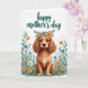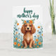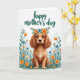 This card shows a caramel-colored puppy with soft, wavy brown fur and large dark eyes that look up with a tender, friendly gaze ❤️. A small wreath of orange and blue flowers with green leaves rests on its head, adding a gentle, romantic touch like a quiet gift. The puppy sits in a loose, painted meadow filled with thin green stems and scattered blooms in orange, blue, and white, including daisy-like flowers with yellow centers 🌼. The background fades from pale blue to white, giving the scene a calm, airy feel that makes the warm fur tones stand out. Light falls softly across the puppy’s face and the petals, bringing out subtle texture without harsh shadows. Near the top, a celebratory message is placed in deep teal lettering, centered above the illustration. Around the puppy’s paws, small white daisies and orange blossoms cluster among the green stems against the light gradient sky.