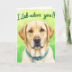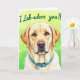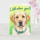 Designed with a close-up portrait of a gentle, golden-toned dog, the card centers its face so the warm gaze meets the viewer like a loyal friend ❤️. Soft, textured fur frames the cheeks, ears, and neck, with fine strands shown in lighter and darker honey shades that make it look touchable. The dog’s eyes shine with amber highlights, and a small pink nose catches the light for a tender, affectionate look. Near the top, a hand-lettered line of text sits above the head in bright green, standing out against the lighter background. A turquoise collar wraps around the neck, adding a cool contrast that feels like a cheerful gift ribbon. The background fades from sunny yellow into fresh green with a gentle, out-of-focus dot pattern that suggests a calm outdoor setting 🌼. The green lettering is placed high and centered, while the collar and face stay crisply detailed against the soft gradient behind them. The final view includes warm yellow at the upper left shifting into leafy green toward the lower right, with scattered soft circles of light.