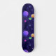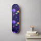 Cartoon illustration of a space scene with planets, stars, and comets, set against a dark blue background. The planets are depicted in various colors, including purple, yellow, green, and blue, each with unique textures and details. The stars are small and white, scattered throughout the scene, while the comets leave trails of light as they streak across the sky. The overall style is whimsical and playful, with a focus on bright colors and simple shapes. The illustration is likely intended for children or those who enjoy lighthearted space-themed art. Digital art.