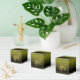 beautiful gradient green background with mustard grains at the top and thin lines twisted with ornaments on the two sides of the box.