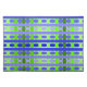 This placemat has a geometric design of lines in shades of blue and green woven to make a plaid.