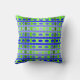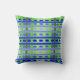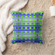 This throw pillow has a geometric design of lines in shades of blue and green woven to make a plaid.