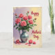 This card features a full bouquet of coral‑pink roses with soft, unfolding petals and rich green leaves, arranged like a gentle gift ❤️. The flowers sit in a brushed, silvery metal pitcher whose cool shine adds a calm, steady touch beside the warm blooms. Behind it, the background fades from lilac on the left to a light golden yellow on the right, giving the scene a cozy, friendly glow. Soft, diffused lighting falls across the roses, as if someone paused to admire them with quiet affection. Near the base, a few rosebuds and loose petals rest casually, like they were set down after a sweet moment shared between close friends. A subtle, slightly worn texture gathers around the outer edges, making the whole image feel like a treasured illustration 🌼. The greeting text appears in flowing crimson letters, placed over the pastel background near the bouquet.