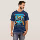 This is some sort of logo design showing a graduation hat within a golden circle and a blue background with confetti all over the image. Perfect design to wear on graduation day.