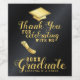 Create stylish personalized black and gold graduation party wine bottle labels with the Thank You For Celebrating With Me message and template for the graduate's name and year. The typography is decorated with grad's cap and diploma illustrations in golden yellow colors.