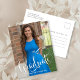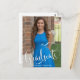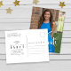 This design features a graduate black and white photo postcard template, a simple stylish elegant template, great for high school or college seniors, a minimalist trendy classy typography, a graduation mortarboard cap hat, class of 2023 2024 2025, perfect for senior picture photo photography, minimal grad party invite, a grad graduation party invite, a senior photo picture photography