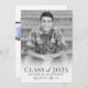 A simple and elegant boho-inspired graduation announcement with a light and bright aesthetic. The front features a full-page photo with a black and white filter and a soft white gradient at the bottom, beautifully framing the text. "Class of 2025" appears in dark gray fonts, followed by the graduate's name and school in elegant handwritten script for a timeless touch. The black-and-white filter can easily be removed in the full editor for a more vibrant look.