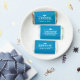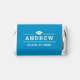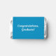 A fresh blue graduation miniature candy wrapper with the graduate's name in bold white block type between horizontal lines and a graduation cap accent. The editable class year and Congratulations, Graduate script on the back make it a ready-to-display party favor. A lively, school-color candy treat for any graduation celebration.