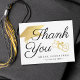 Custom graduation thank-you note card with faux metallic gold foil graduation cap or mortarboard and diploma and elegant calligraphy script THANK YOU typography and personalized with the graduate's name and class year on the front and the option to pre-print a thank you message on the back or opt to delete the sample text to leave the area blank for handwriting notes of appreciation. ASSISTANCE: For help with design modification or personalization, color change, resizing, transferring the design to another product or if you would like coordinating items, contact the designer BEFORE ORDERING via the Zazzle Chat MESSAGE tab below or email makeitaboutyoustore@gmail.com.